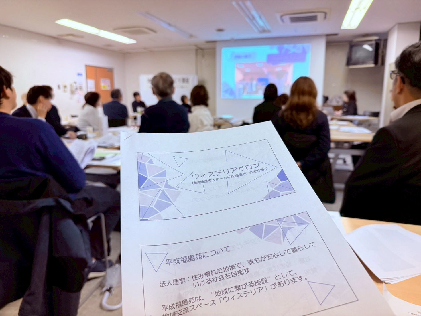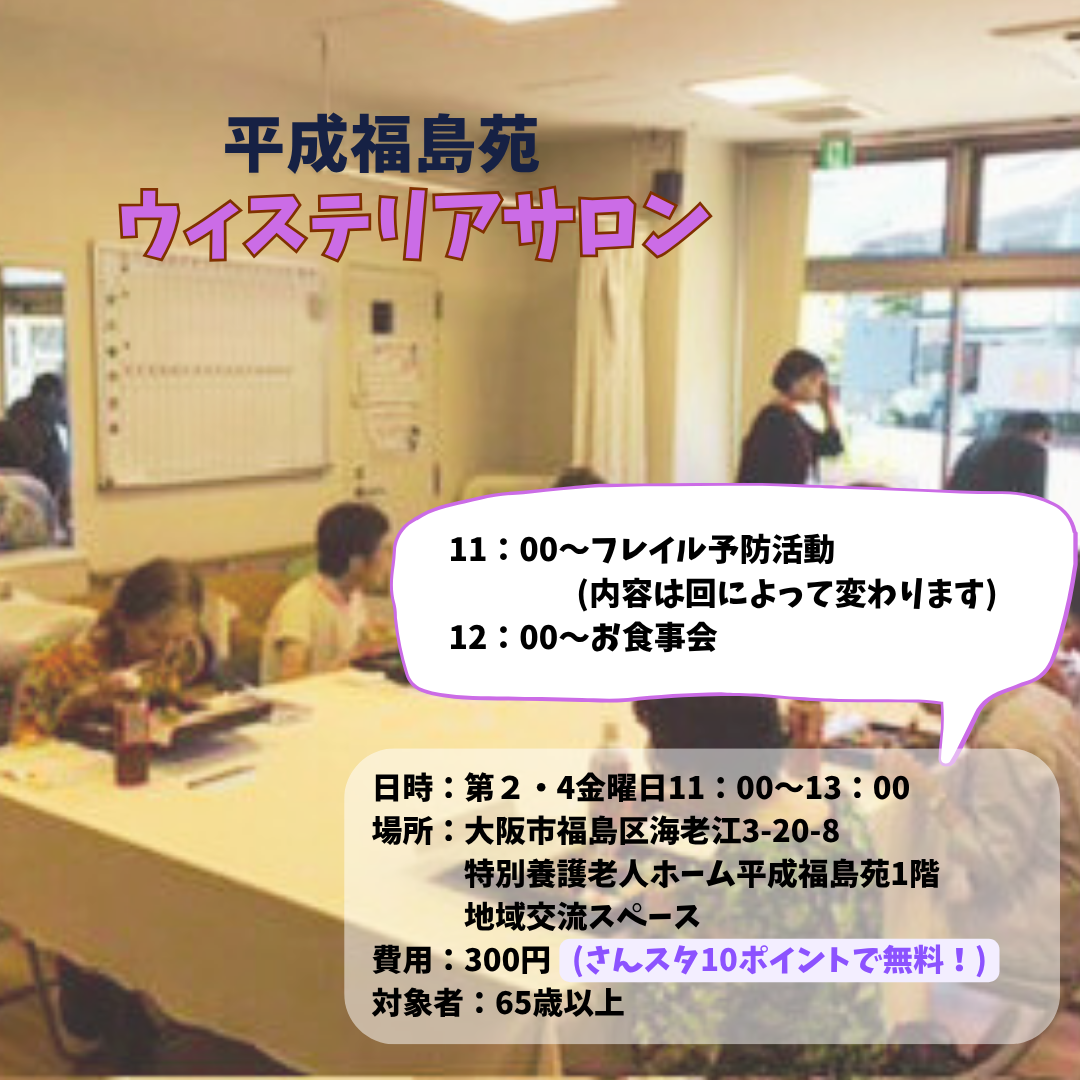 令和8年3月3日(火)、NORBDENCE福島区民センターにて開催された「地域の居場所づくり講座」(主催:福島区コミュニティサロン連絡会)に参加し、平成福島苑 地域交流スペース「ウィステリア」で活動しているウィステリアサロンについてお話させていただきました。